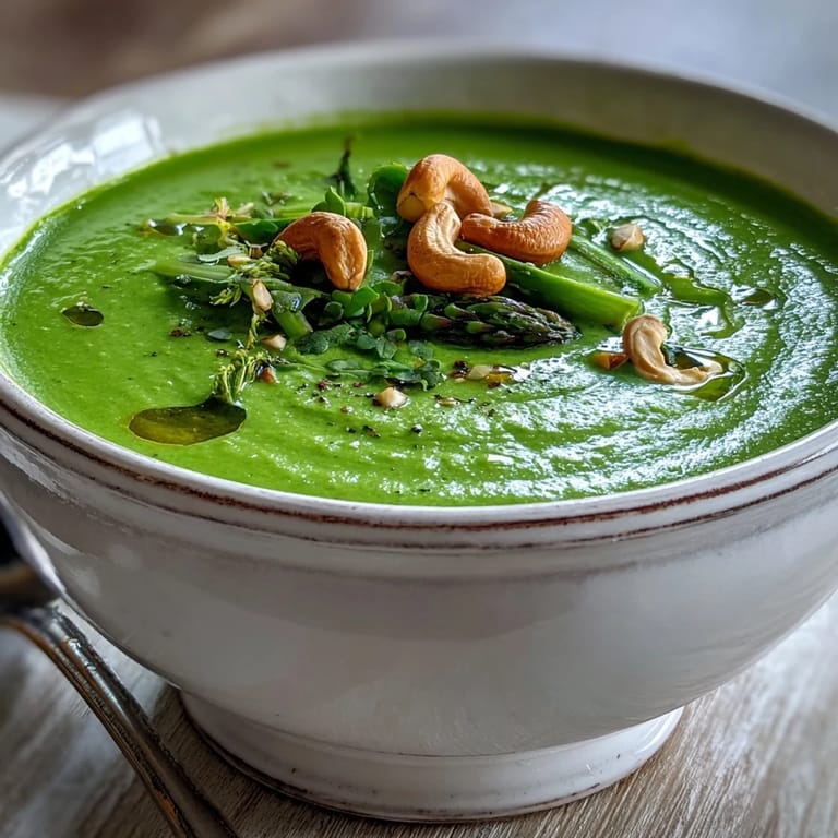 Save There's something quietly powerful about a bowl of green soup—the kind that looks almost too vibrant to be real, like you've somehow captured spring in a pot. I first made this version on a gloomy February afternoon when my immune system felt as gray as the weather outside, and I wanted something that felt like eating actual wellness. The cashews were my secret weapon that day, transforming what could have been a thin broth into something luxuriously creamy without a drop of dairy.