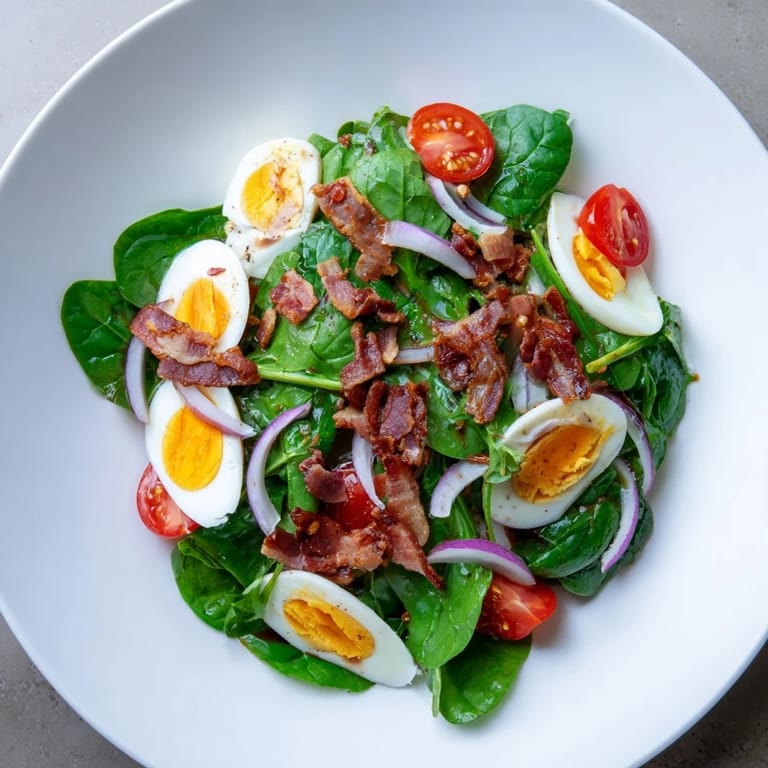 The magic of this salad lives in the moment where everything is still at its best: the bacon's still crispy, the eggs are still warm, the spinach is still bright. If you let it sit for ten minutes before eating, you haven't ruined it, but you've lost something. The warm eggs and bacon wilt the spinach just slightly, creating this soft-then-crispy contrast that's harder to achieve if everything cools down together. Make this salad right before you eat it, or at least keep the components separate until the last possible second.